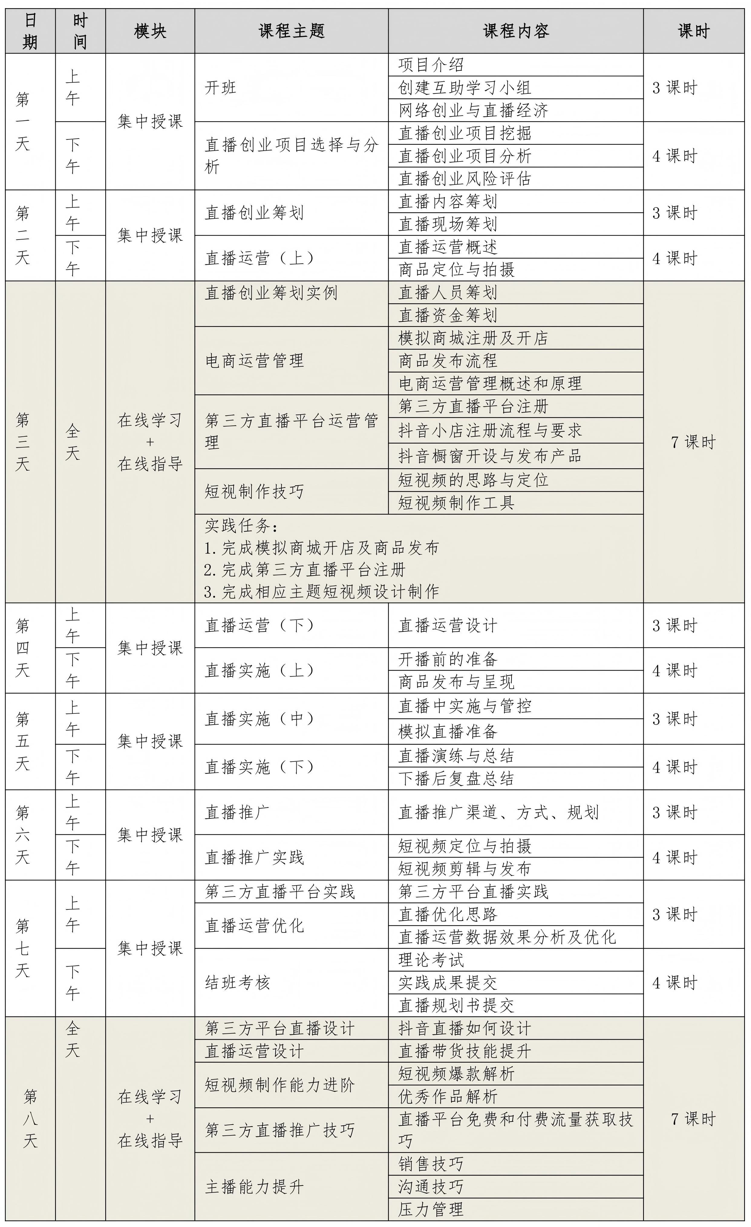 网络创业(直播)培训课程指导学员通过“直播+”的方式开展创业,是互联网知识与创业技能相结合的特色课程。该课程引入翻转课堂理念,实现线上+线下相结合的教学模式。更好地启发学员的互联网创业意识,帮助学员快速了解创新创业基础知识,通过模拟直播训练快速上手直播的操作技能,规避试错风险,并通过第三方实践平台演练,掌握运用互联网的工具和方式进行产品营销推广。最终通过系统学习,完成直播规划书及实践成果,进而推动向创业实践的转化。现将有关事项通知如下。